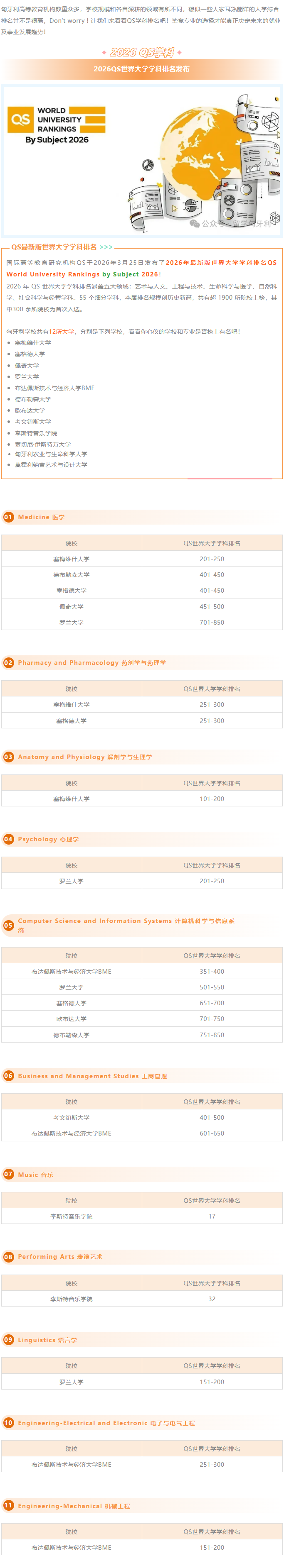 2026QS世界大学学科排名发布!匈牙利表现如何?